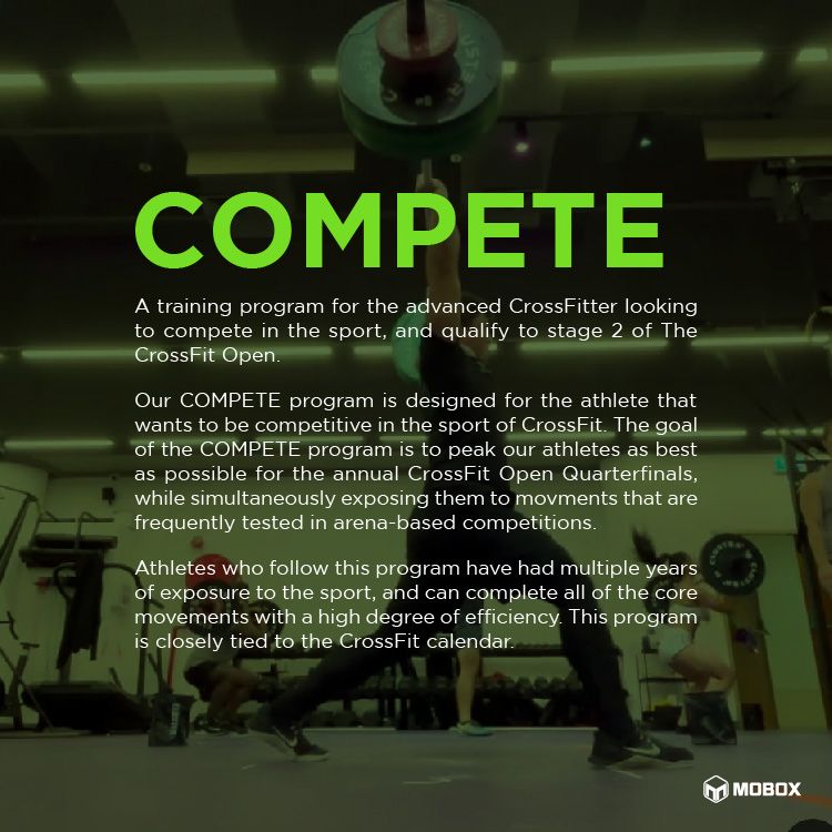 The Compete program is a progressive training program – each training block has a specific set of objectives, which are communicated to our members weekly. This program is closely tied to the CrossFit calendar, and one of the objectives is to prepare our followers for the CrossFit open every October.