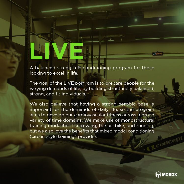 The Live program is for individuals who enjoy mixed modal fitness training, but do not have aspirations to be competitive in the sport of CrossFit.