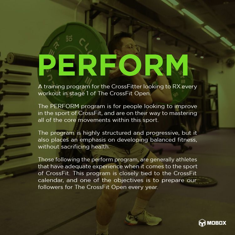 The Perform program is for people looking to improve in the sport of CrossFit, and are on their way to mastering all of the core movements within this sport.